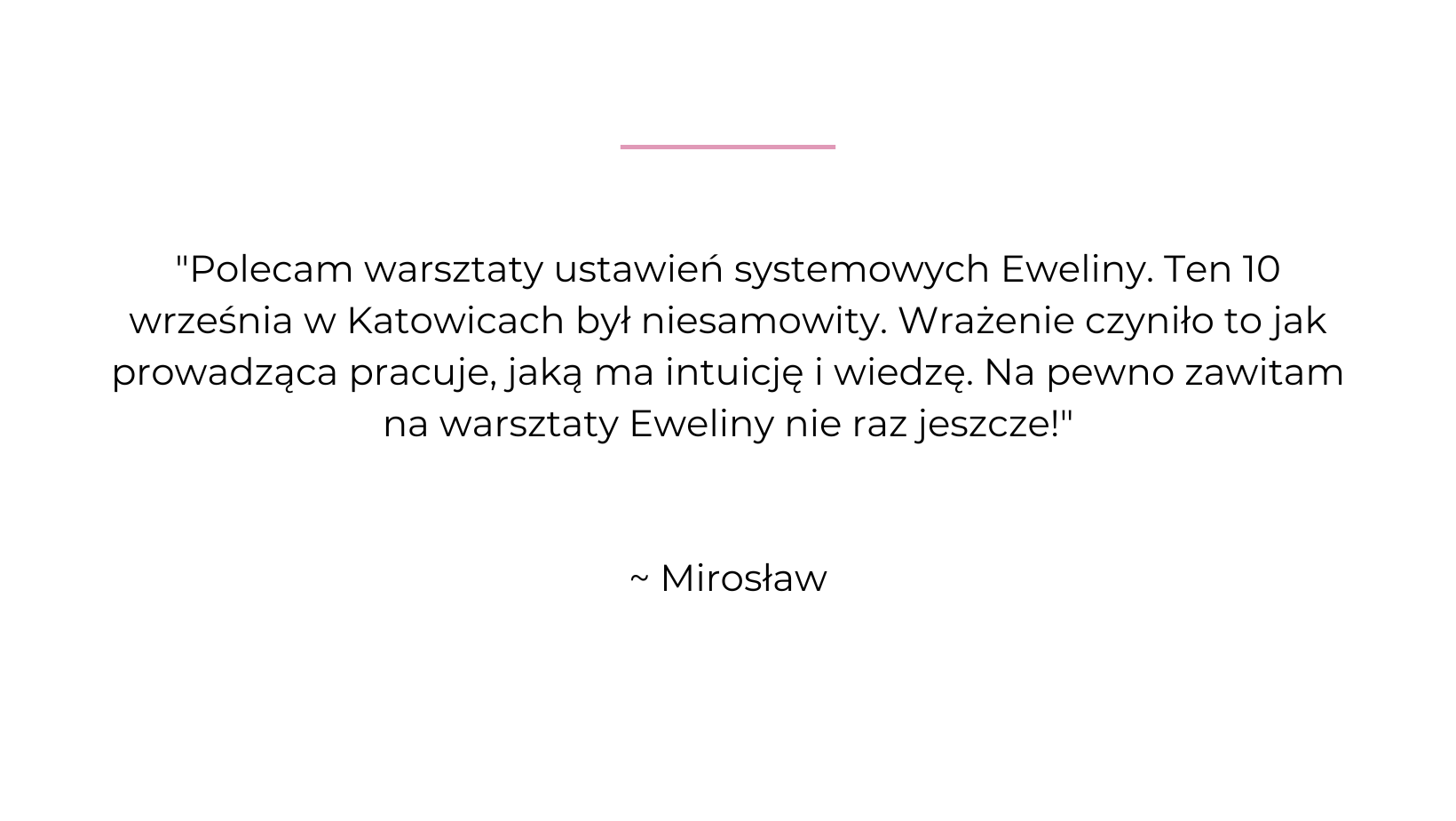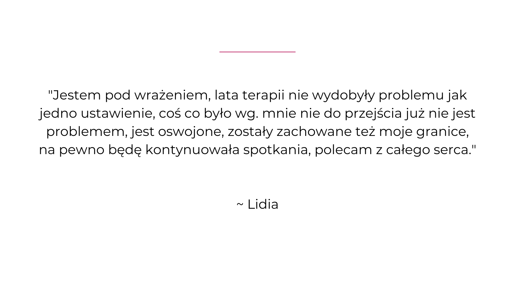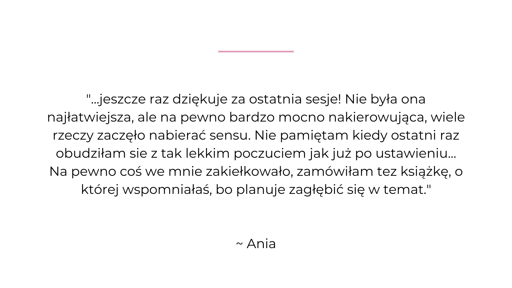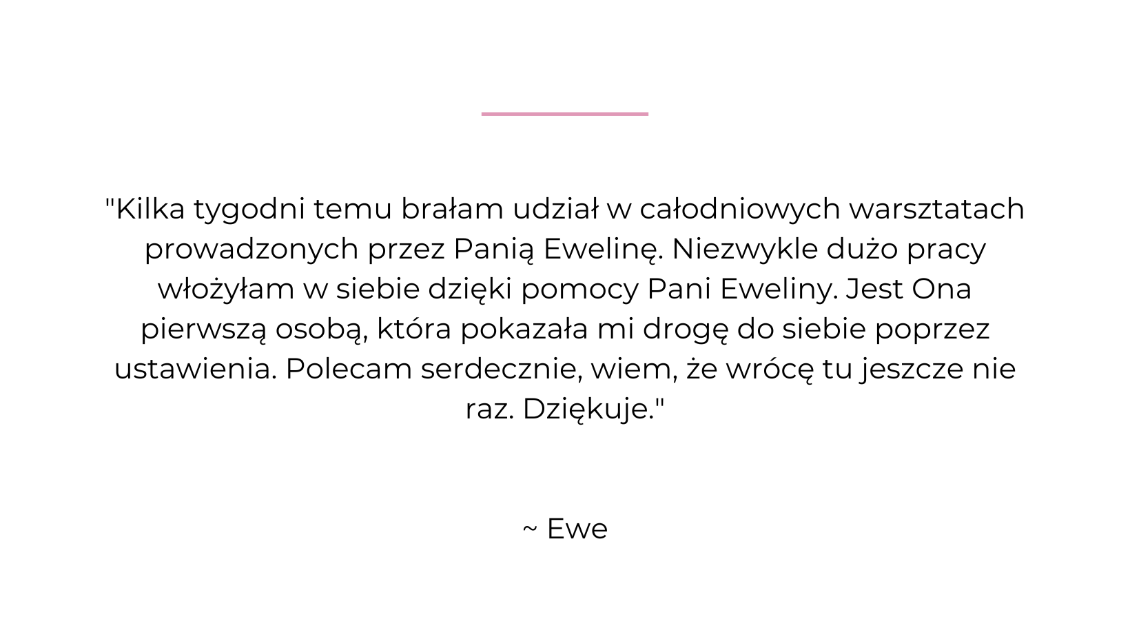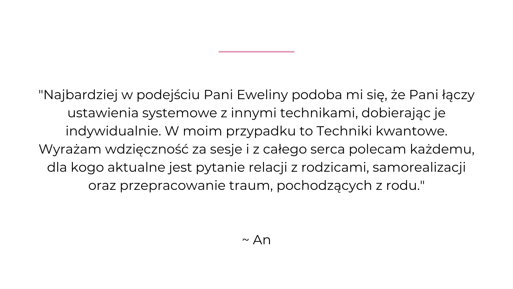 Jestem certyfikowanym praktykiem ustawień systemowych, z doświadczeniem w pracy z traumą i procesami wewnętrznymi. Ponadto ukończyłam szkolenia z Internal Family System (System wewnętrznej rodziny), Theta Healing (I stopień) oraz Reiki (I stopień). Zdobywałam wiedzę i praktykę u doświadczonych mentorów, w tym Damiana Janusa, A. R. Austermanna, Wolfganga Deußera, Katarzyny Dworaczyk, Lizy Kośny i Wojciecha Gwardysa. Z wykształcenia jestem pedagogiem, a moją pasją pozostaje człowiek i jego wewnętrzna pełnia.